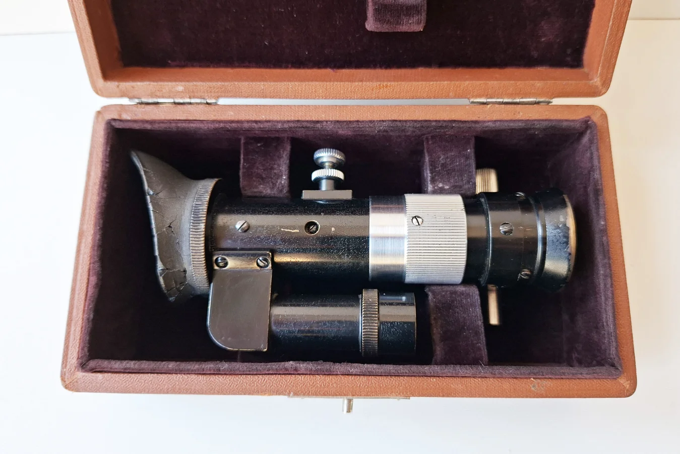 This optical instrument is designed for the precise observation of light spectra. Dating back to the mid-20th century, it is likely a model from the 1920s. The device features a black lacquered brass body equipped with an adjustable slit and a prism set. It includes an achromatic lens for high-quality visual clarity. The instrument comes in its original velvet-lined hard case.